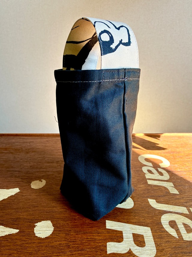持ち手にoyajiを刷った、drink bagです ネーミングはdrink bagではありますが 小物入れなどで使うのも良いと思います ペットボトル500mlが入ります もうちょっと太めのものも入るサイズ感です 黒生地は 張り感のある質感の綿素材で さほど地厚ではないですが、しっかりめ、 ほんのりぱりっと感もあります 持ち手部分の生地は 帆布素材で、しっかりした素材感です 生地色は、真っ黒というより やや褪せた雰囲気のする明るい黒色です 絵柄 / oyaji material / ・本体&持ち手 綿100% (持ち手は帆布素材) ・printインク - シルクスクリーンインク(合成樹脂-アクリル,ポリウレタン) ・ネームタグ - 綿麻混地 size / H 18.5 W 16 D 7.5 cm 持ち手幅 5.3 長さ 15.5 cm 程 *素材の性質によって洗濯後、縮みが出る場合がございます 乾燥機使用は生地素材によっては大幅に縮むことがあります *掲載画像は、 自然光,室内光、影や光の当たっている等撮影時の環境などにより、やや違っています また、 実物とデジタル画面で見る色味には やや差異がございます あらかじめご了承くださいませ☆