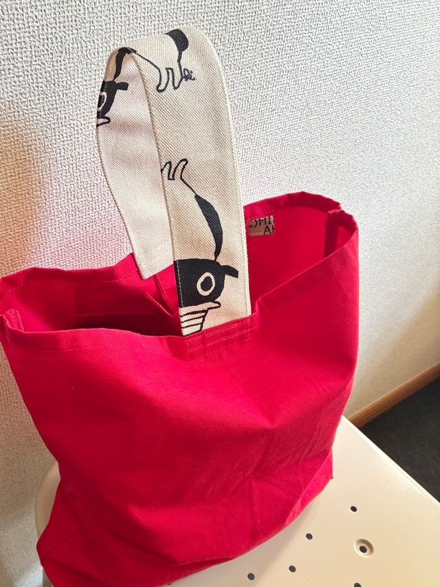 持ち手にペンギンcapの絵柄が入った赤地bagです 内ポケットと、 口を閉じられるよう 内紐付きです 生地の 本体赤は、ほんのり張りのある 薄生地になります 持ち手は帆布地でしっかりめです どちらも綿素材です この赤地がお気に入りで前から使っています 色落ちは大丈夫だったと思いますが ご心配の方は最初のお洗濯時、単体で洗ってみてください☺️ 絵柄 / ペンギンcap material / ・本体 赤地, 持ち手部分 共に綿100% ・printインク - シルクスクリーンインク(合成樹脂-アクリル,ポリウレタン) ・ネームタグ - 綿麻混地 size / H 32 W 35 D 5 cm 持ち手幅 5 cm長さ36 cm ほど 内ポケット H14 W14.5cm 内紐幅2.5 長さ18.5cm程 *素材の性質によって洗濯後、縮みが出る場合がございます 乾燥機使用は生地素材によっては大幅に縮むことがあります *掲載画像は、 自然光,室内光、影や光の当たっている等撮影時の環境などにより、やや違っています また、 実物とデジタル画面で見る色味には やや差異がございます あらかじめご了承くださいませ☆