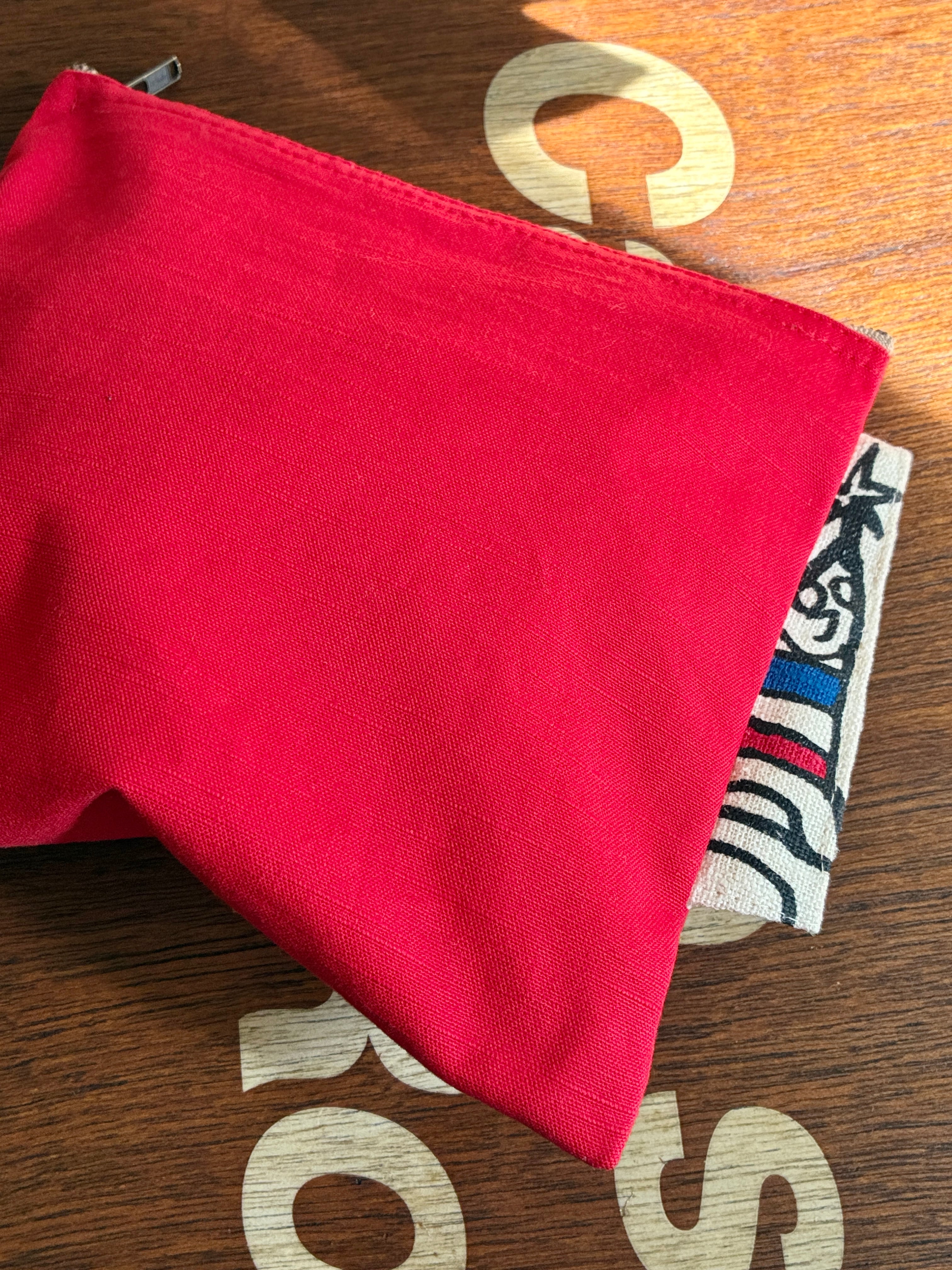 エッフェル塔くんを刷った布タグをサイドに付けた、まち無しポーチです 生地二枚仕立てで作っているので、 しっかりした生地厚です 絵柄は 本体には刷っていなく、 サイドに付いた布タグにエッフェル塔くんを刷りました ファスナーは ブロンズ色のメタルファスナーです この赤地がお気に入りで前から使っています 色落ちは大丈夫だったと思いますが ご心配の方は最初のお洗濯時、単体で洗ってみてください☺️ 絵柄 / エッフェル塔くん material / ・本体 綿100% ・printインク - シルクスクリーンインク(合成樹脂-アクリル,ポリウレタン) ・イラストタグ, ネームタグ 綿麻混地 size / ・本体 H 18.3 W 19.5 cmほど ファスナーの開き 17.5 cm ・布製タグ部分 H 10.6 W(最大)2.4 cm *素材の性質によって洗濯後、縮みが出る場合がございます 乾燥機使用は生地素材によっては大幅に縮むことがあります *掲載画像は、 自然光,室内光、影や光の当たっている等撮影時の環境などにより、やや違っています また、 実物とデジタル画面で見る色味には やや差異がございます あらかじめご了承くださいませ☆