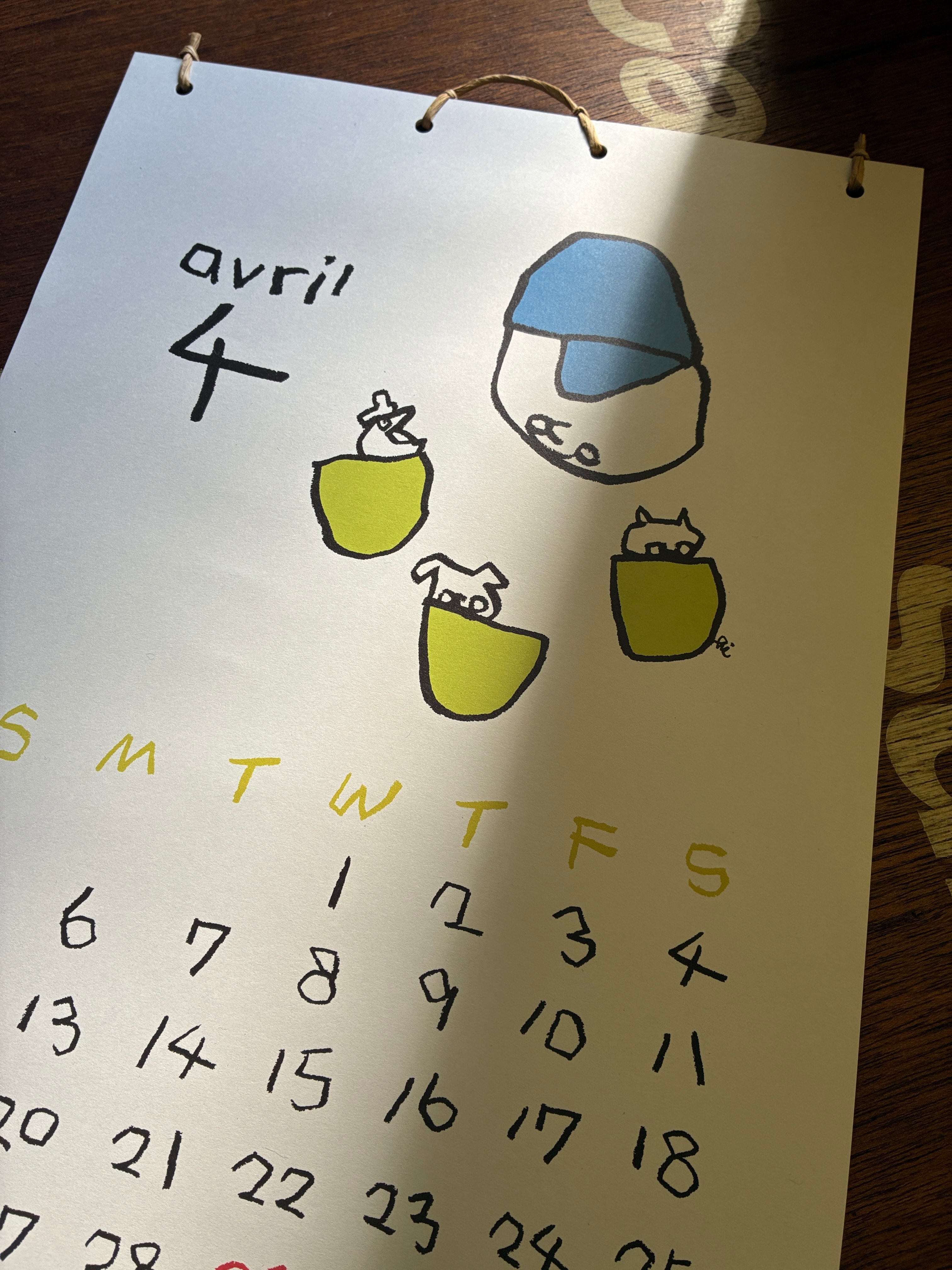 ¥2,500-(税込み¥2,750-) Hikari Akasaイラストレーション、B4サイズの4月始まりカレンダー もともと販売用としてではなく、 自分が使うためにつくり始めたこの4月始まりカレンダーです 描いたイラストたちが 英語は嫌だ、フランスが好きだからフランス語を使ってくれと言うので、月はずっと フランス語表記です☺️ 12ヶ月の印刷は、 印刷業者に外注していますが 製本などは自分です 製品すぎるのは嫌で、かといって 手作り感あふれているものも好みではないので、その中間のような雰囲気の カレンダーになっています ○カレンダーを括っているのは 極細針金入りのクラフト紙紐です *紙紐の先端に、少し針金が見えていたり ほんのり出ている場合がありますので 小さなお子さんや動物が触れる際には注意してあげてください ○カレンダーの用紙中に、 ごく小さな黒点等が見受けられますが、汚れではなく再生紙を利用しているためです ○最背面に、黄ボール紙を使用しています ☆商品実物と、デジタル画面で見る色味には やや差異がございます あらかじめご了承くださいませ