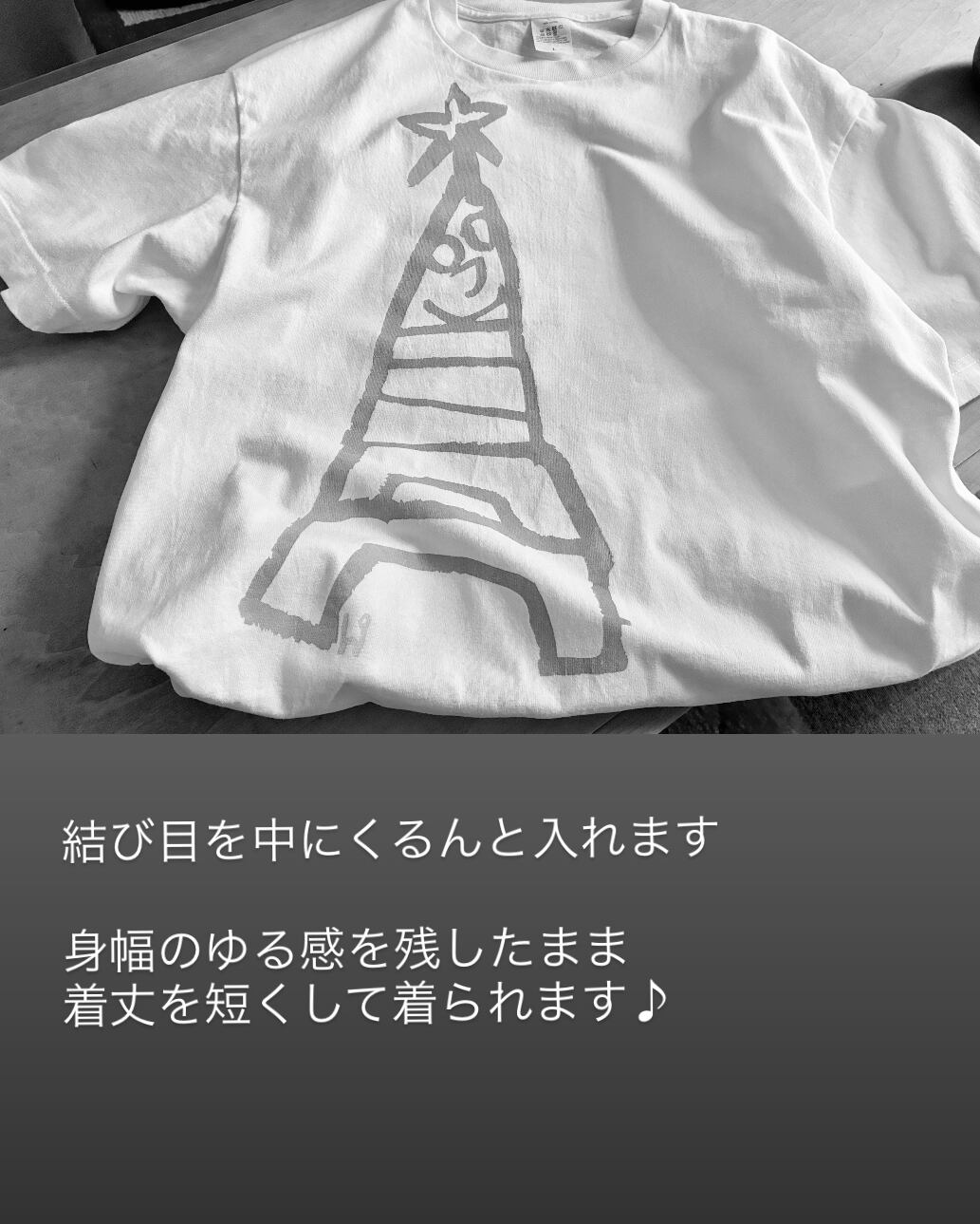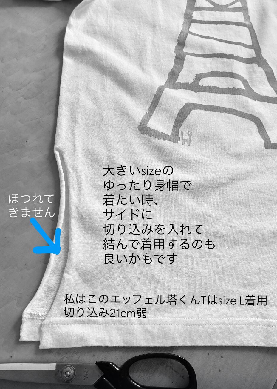 Tシャツサイズを上げると必然的に身丈が長くなるので、片側サイドの裾から切り込みを入れ、結んで着丈を短く着用しています