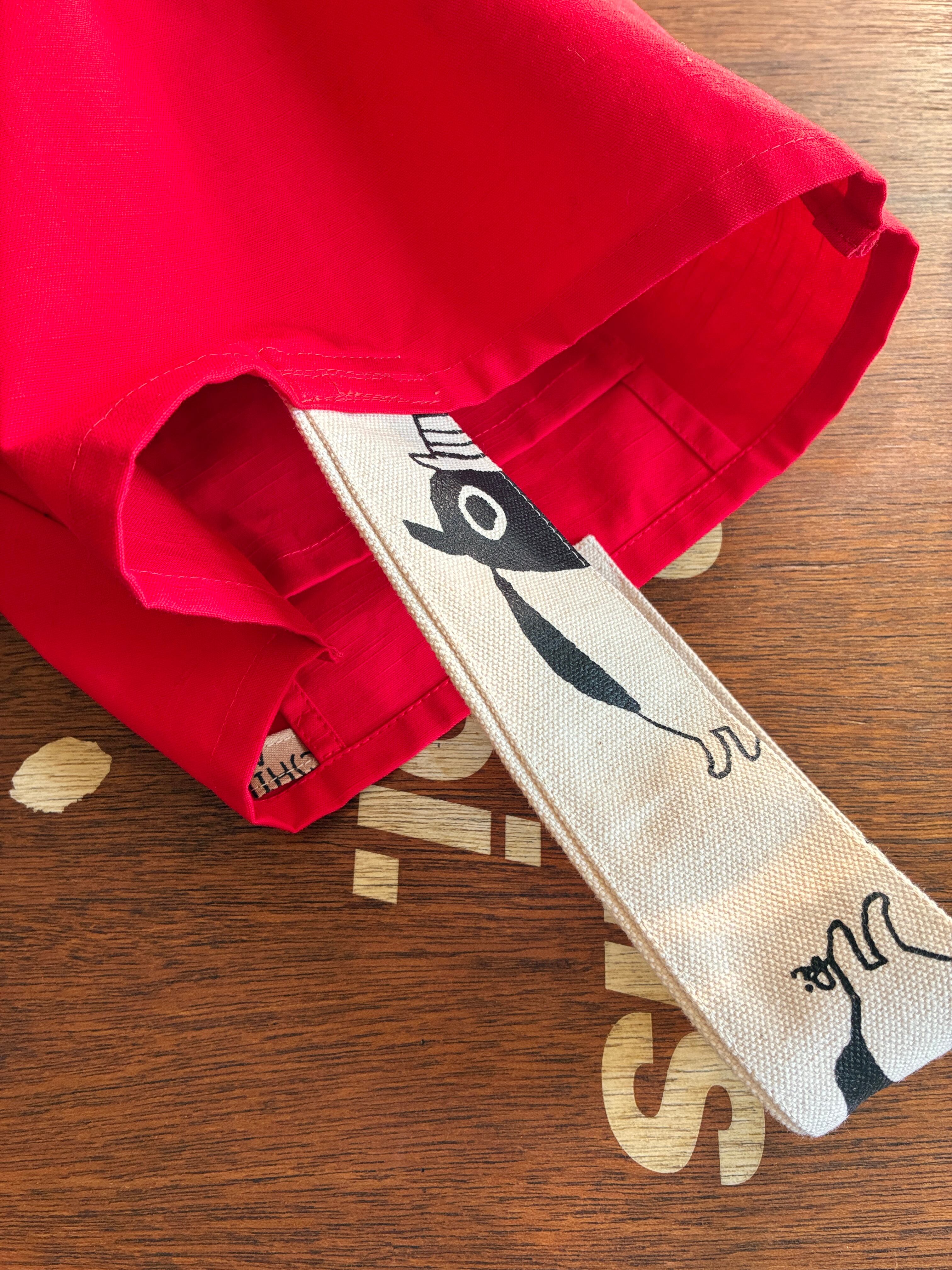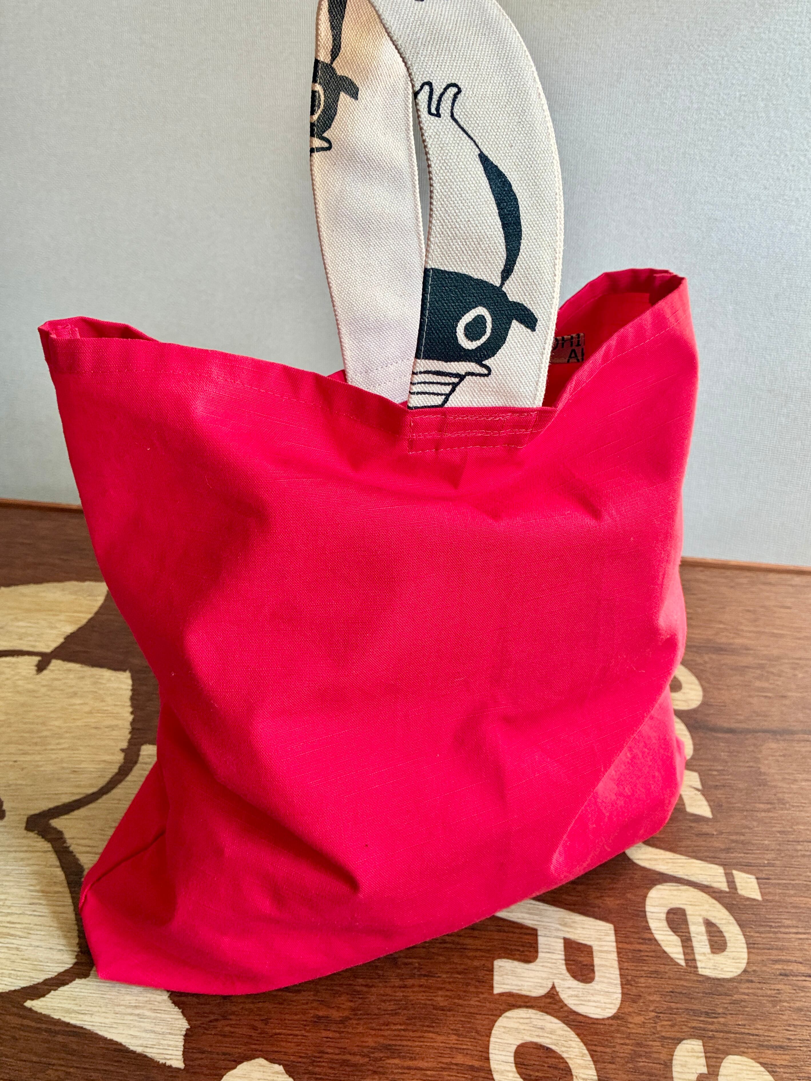 持ち手にペンギンcapの絵柄が入った赤地bagです