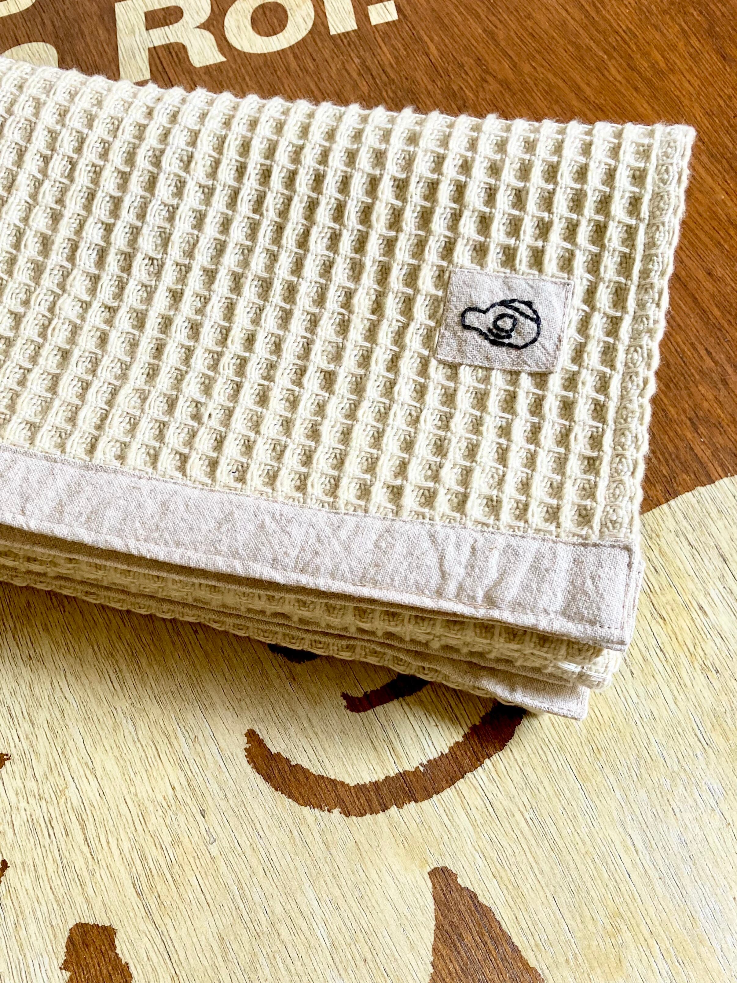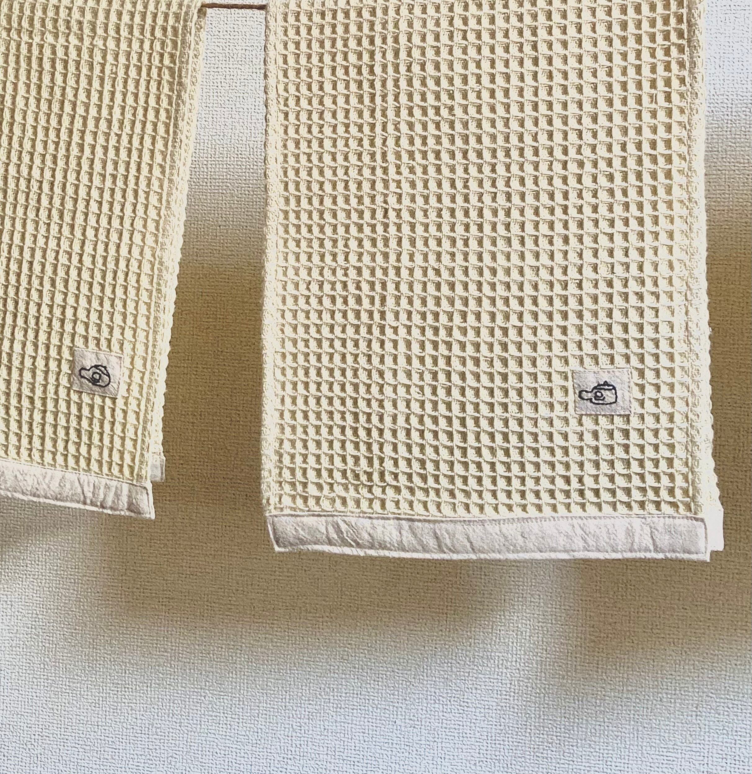 別布ミニ刺繍が付いたwaffle地タオルです。